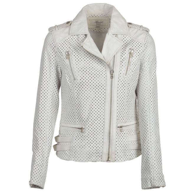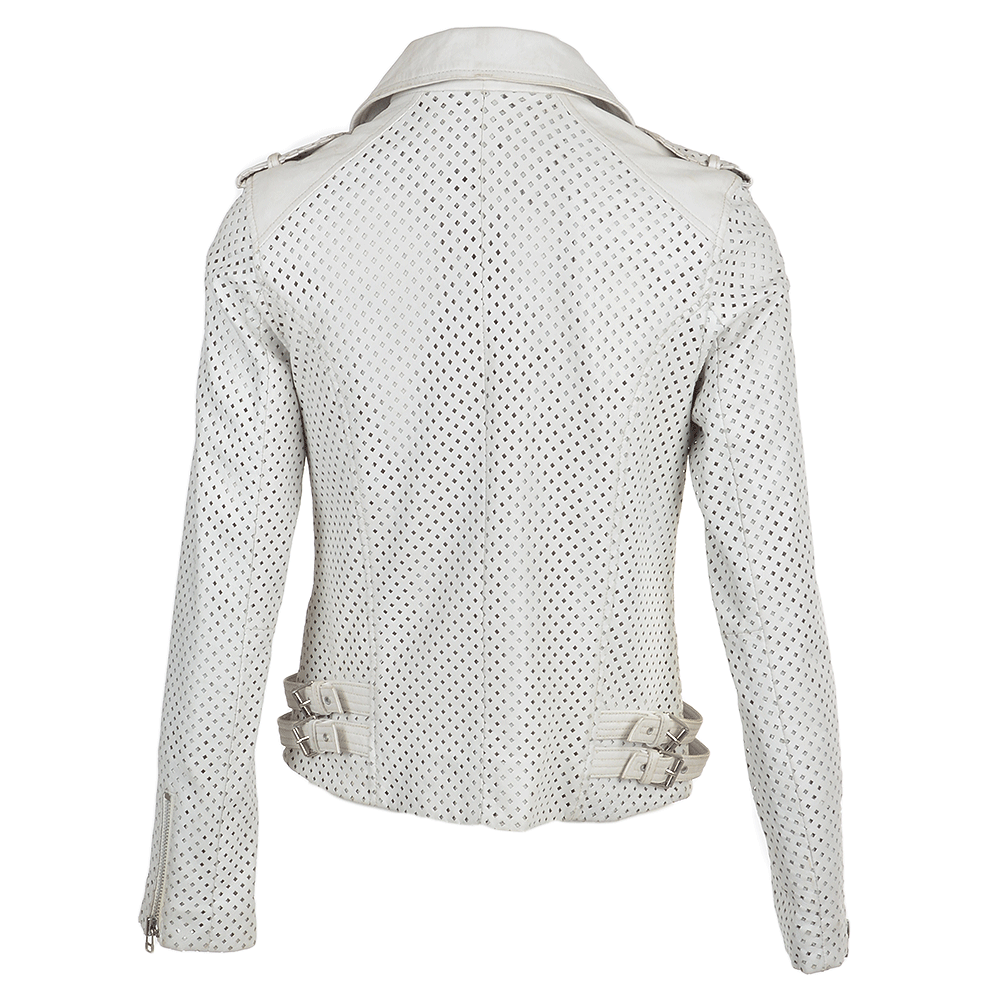 Online exclusive. This stylish ladies and girls white leather biker jacket is crafted with small diamond perforated detail. With its impressive attention to detail, silhouette finish and a leather feel which blends luxury and practicality in one. Expect four functional pockets to the external body.Ideal for warm day.