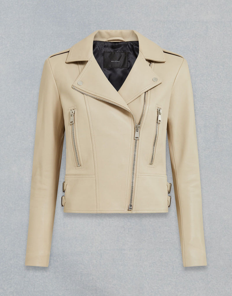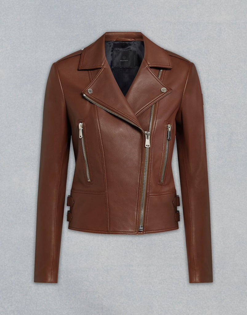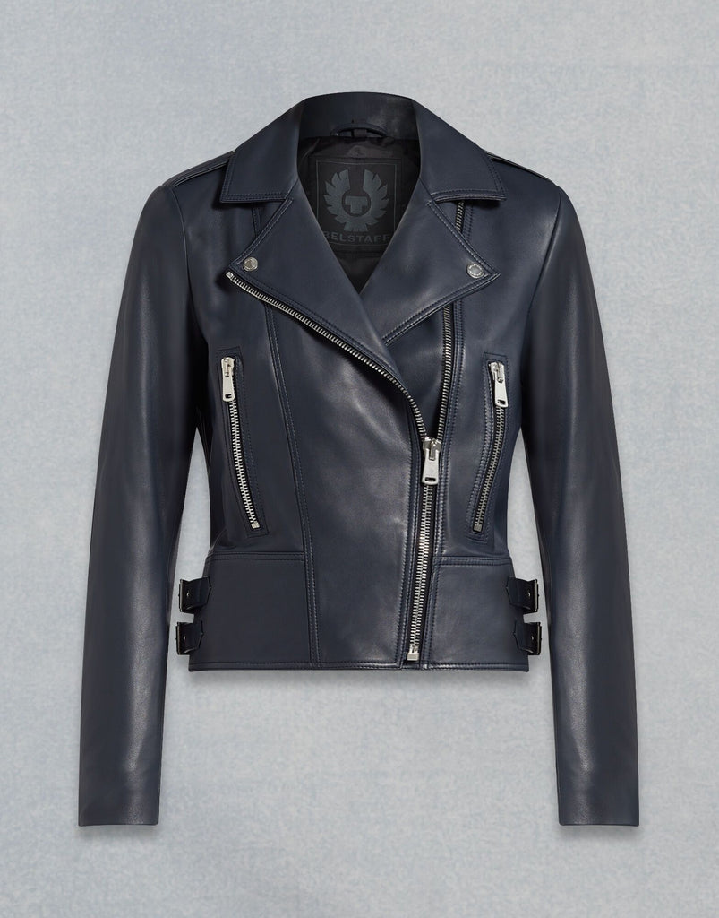 The women’s Marvingt 2.0 jacket, in Dark Tudor, is crafted from vegetable tanned nappa leather, giving a polished appearance. A subtle wax coating adds a luxurious feel to this clean biker style, with exposed asymmetric zip fastening and two side zip pockets. The zip detailing is carried through to the cuffs, while adjustable side buckles allow for a custom fit, and padding on the elbows add practical protection. Additional detailing includes studded epaulettes and a leather Belstaff patch on the left sleeve.