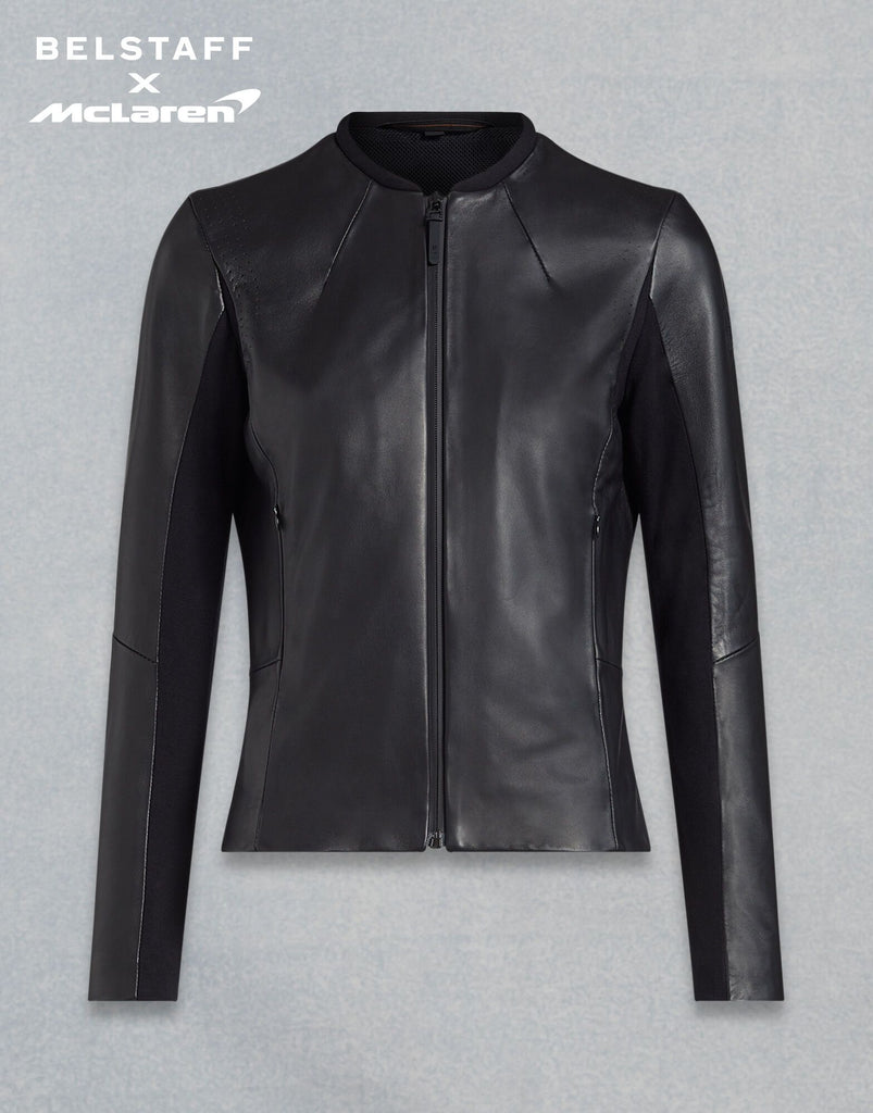 Crafted for comfort from supple lamb skin, this modern, café racer style women’s leather jacket, in black, is the pinnacle expression of the Belstaff x McLaren collaboration. Engineered perforation regulates temperature, while underarm jersey panels allow for increased freedom of movement. The central zip fastening features a Belstaff x McLaren dual branded rubber pull tab. The elegant silhouette also features a minimal collar to allow for maximum visibility, hidden zippers in the cuffs and ergonomic seam lines.