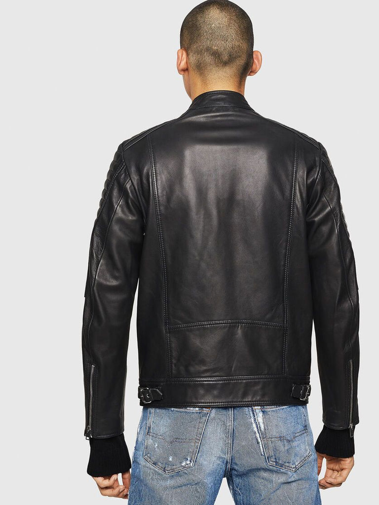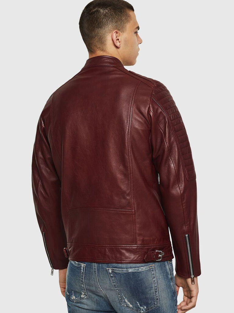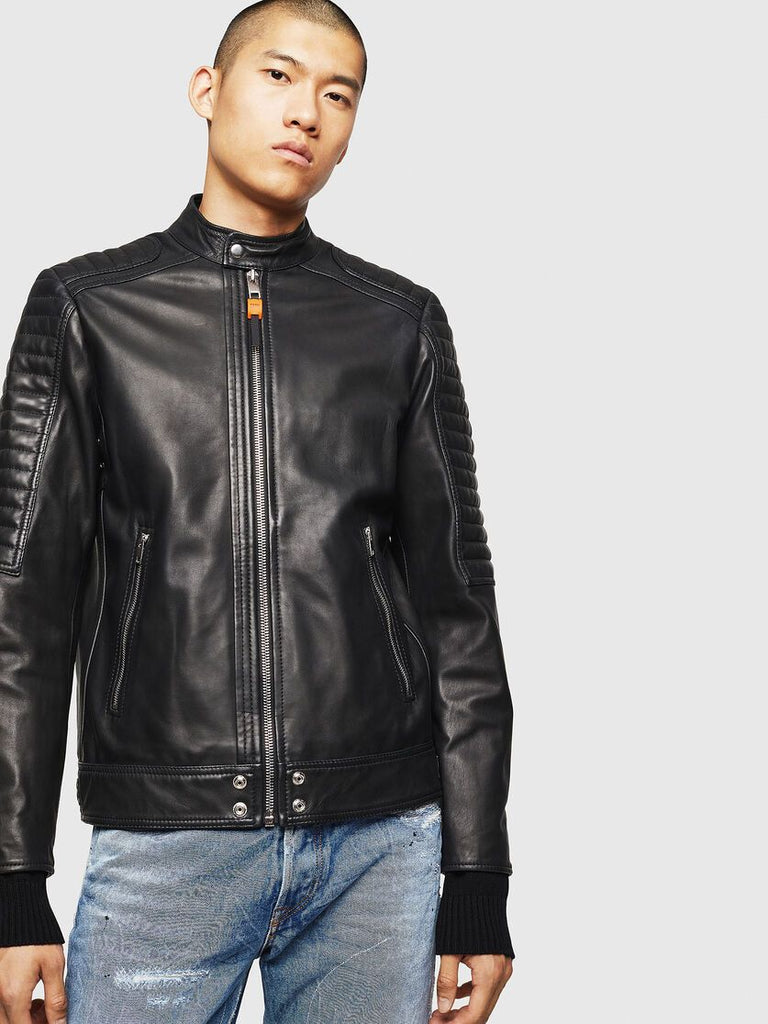 This leather biker jacket is made from washed sheepskin. Stitching and padding on the sleeves and zip pull complete the style.