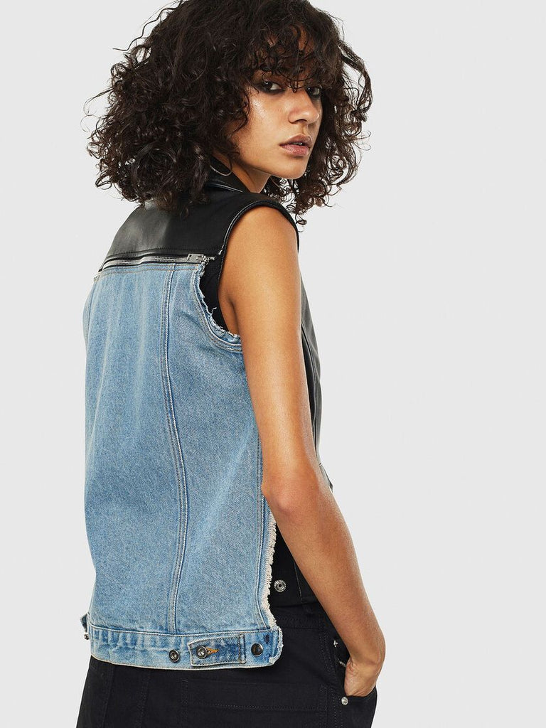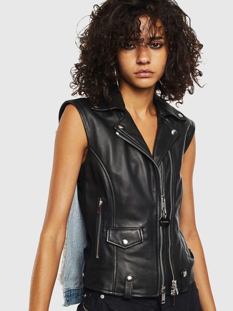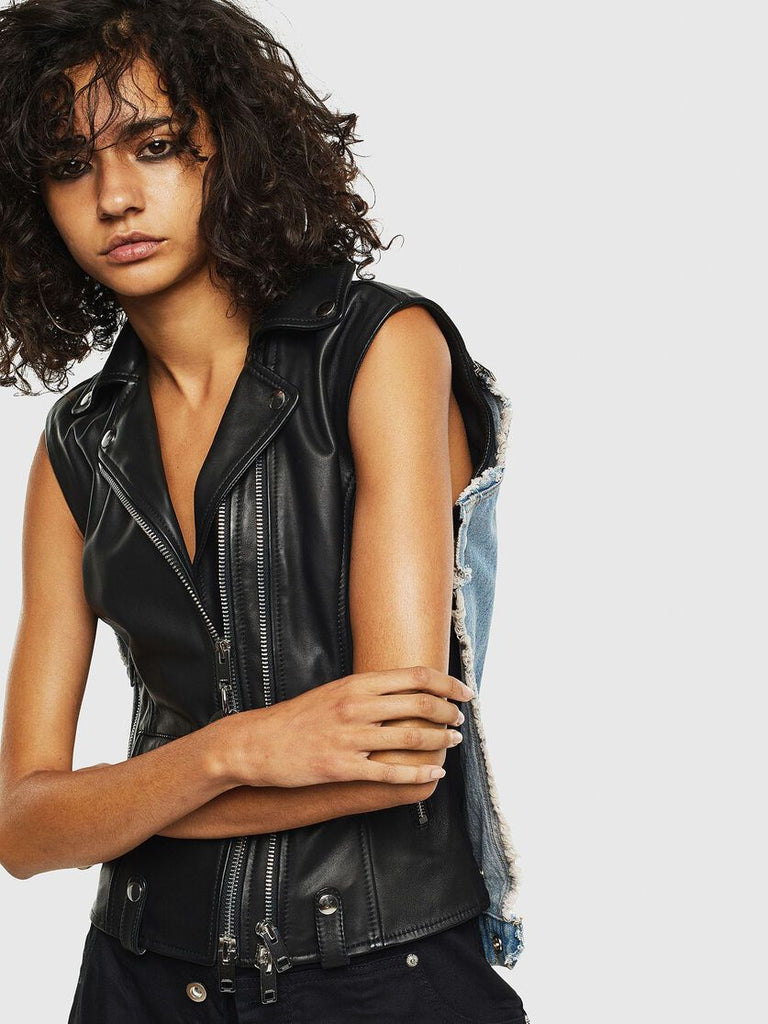 This biker vest is crafted from sheepskin leather, with a classic spread collar and double zip closure. It has a treated denim back panel that can be removed, revealing a super-stretch jersey fabric underneath.