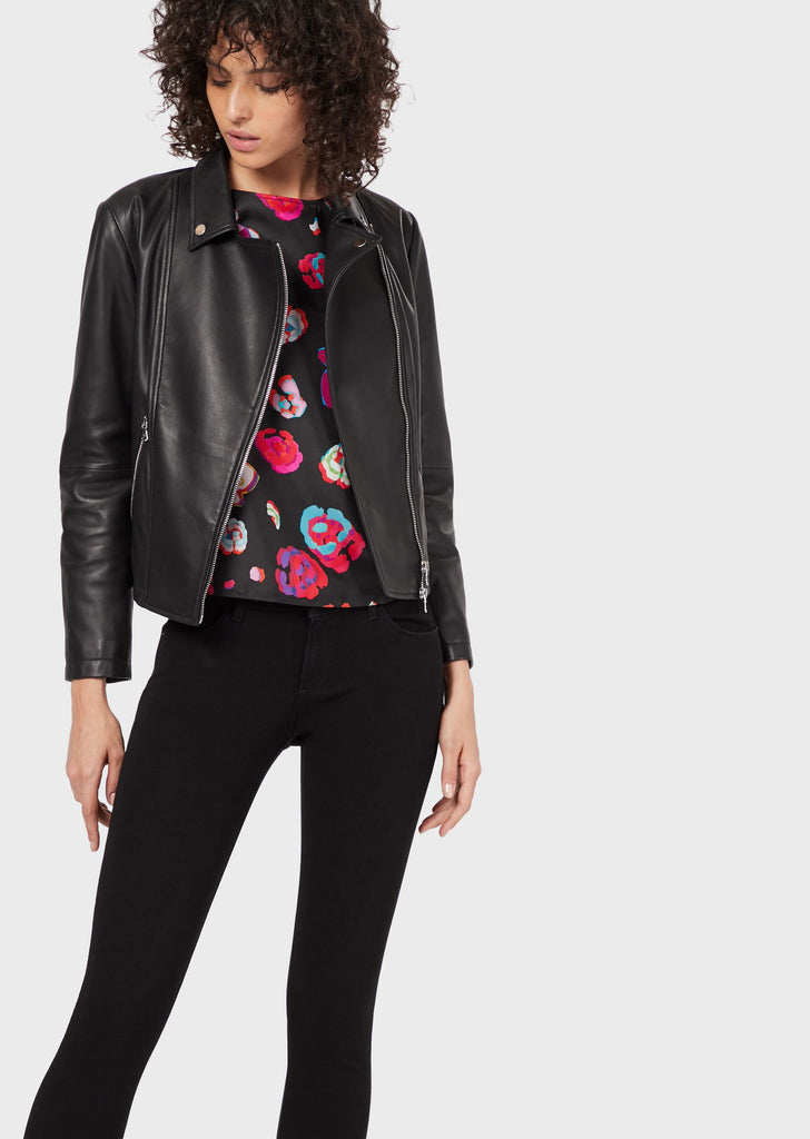The leather biker jacket is reinvented to reflect the latest trends and full charm of Emporio Armani, making it a key item in any woman’s wardrobe. This lined garment is made from high-quality, semi-aniline, lambskin nappa leather. It features the classic off-centred fastening typical of biker jackets.