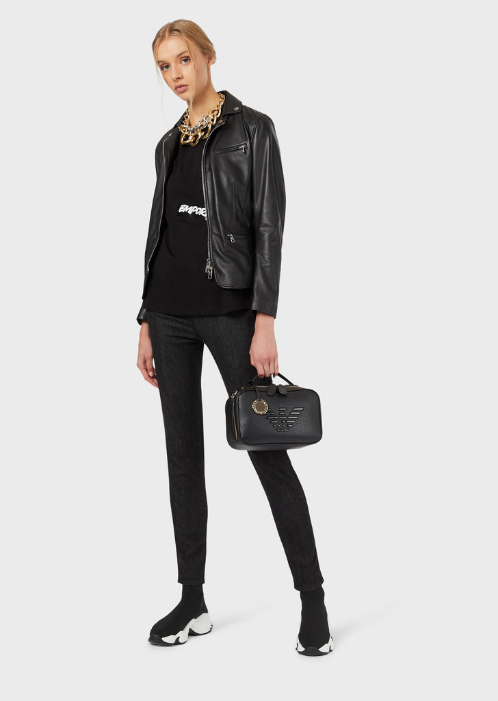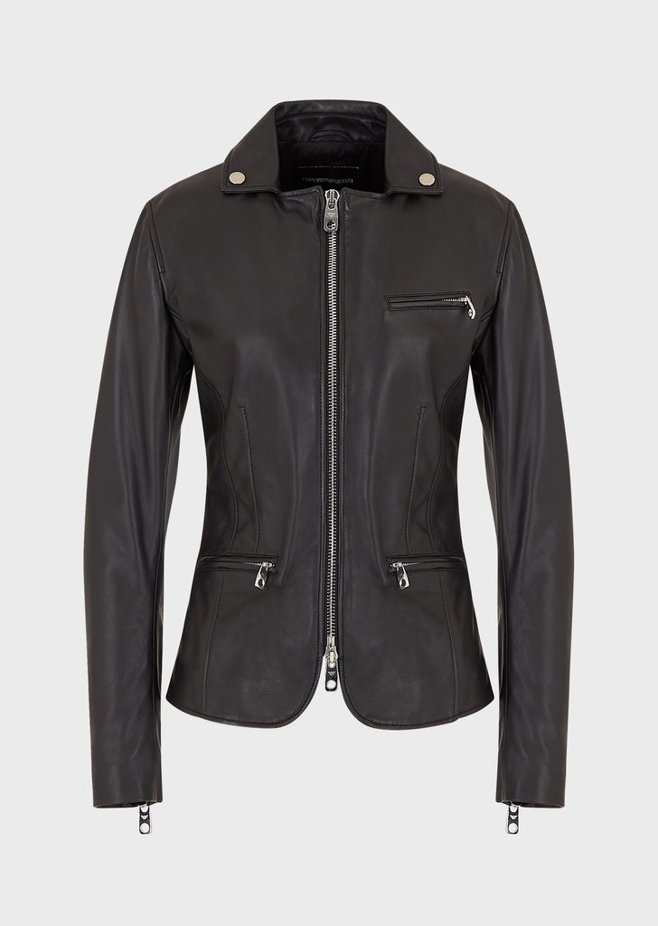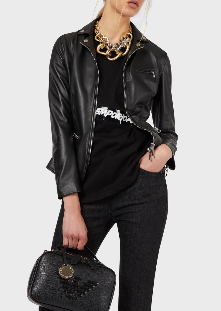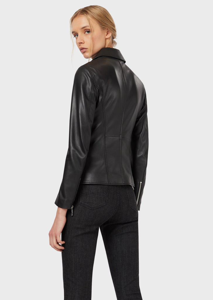 The leather biker jacket is reinvented to reflect the latest trends, acquiring all the charm of Emporio Armani. This style of this high-quality semi-aniline lambskin nappa leather, item is decidedly feminine enhancing the body’s natural shape at the same time not giving up on the edgy appeal of the biker jacket. Fully lined, it has a double-slider zip fastening.