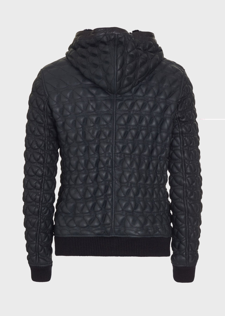 This unique, refined item will make your winter wardrobe stand out with exclusivity, through its use of extremely high-quality materials and artisanal techniques. Napped Spanish Merino shearling blouson jacket, embroidered with elastic threads that create a raised, curved and braided effect. This item has a hood, asymmetrical closure, and zipped front pockets with matching wool trim.