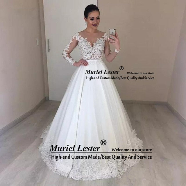 Luxury Lace Princess Ball Gown Wedding Dresses Sheer Neck Illusion Long Sleeves Appliques Country Bridal Dress Vestido De Noiva