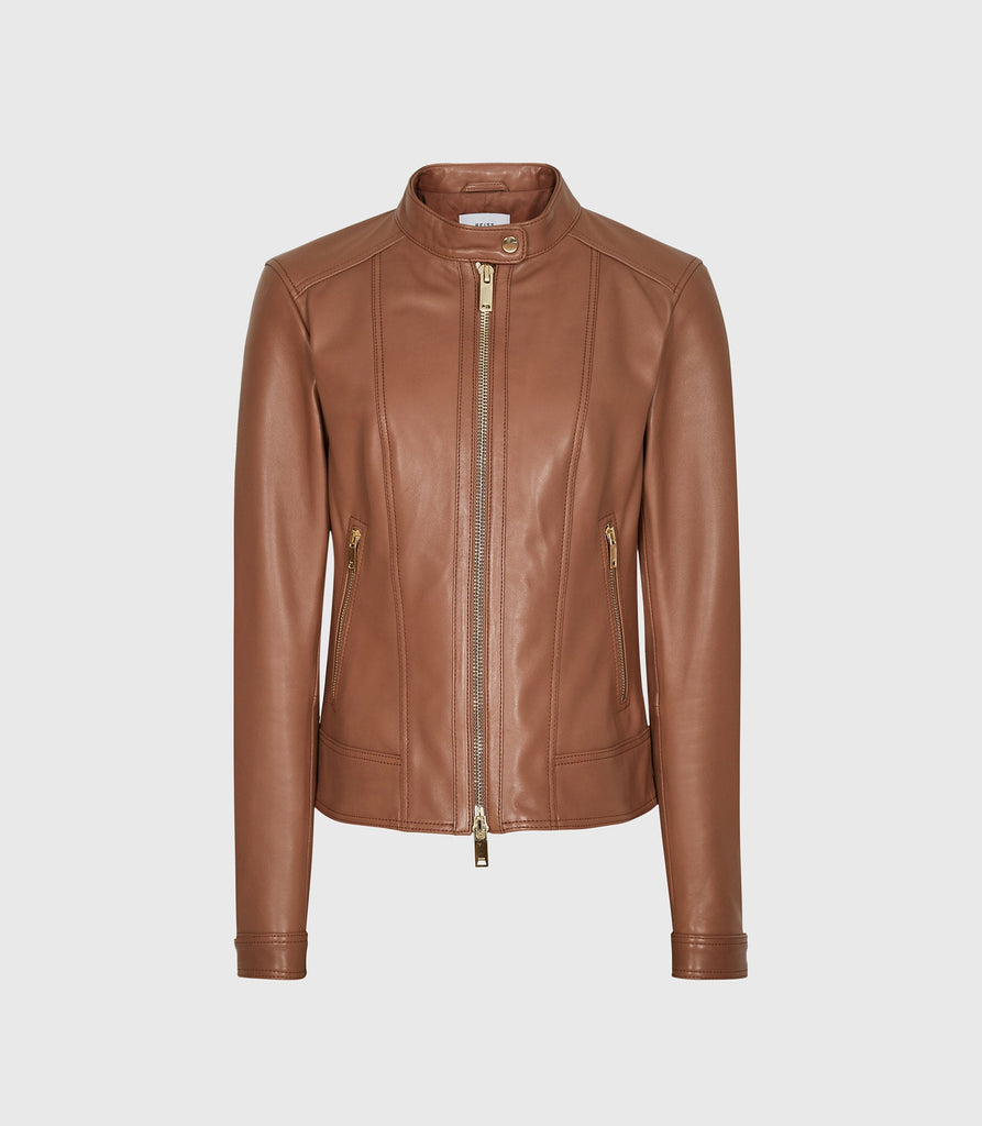 Sleek in silhouette with a collarless neckline and a double-ended zip, the Fawn leather jacket in tan is a modern riff on a wardrobe hero. It's designed using a butter-soft leather and is fully lined for comfort, but will lend any off-duty look a tough-luxe edge.