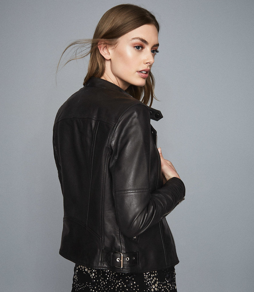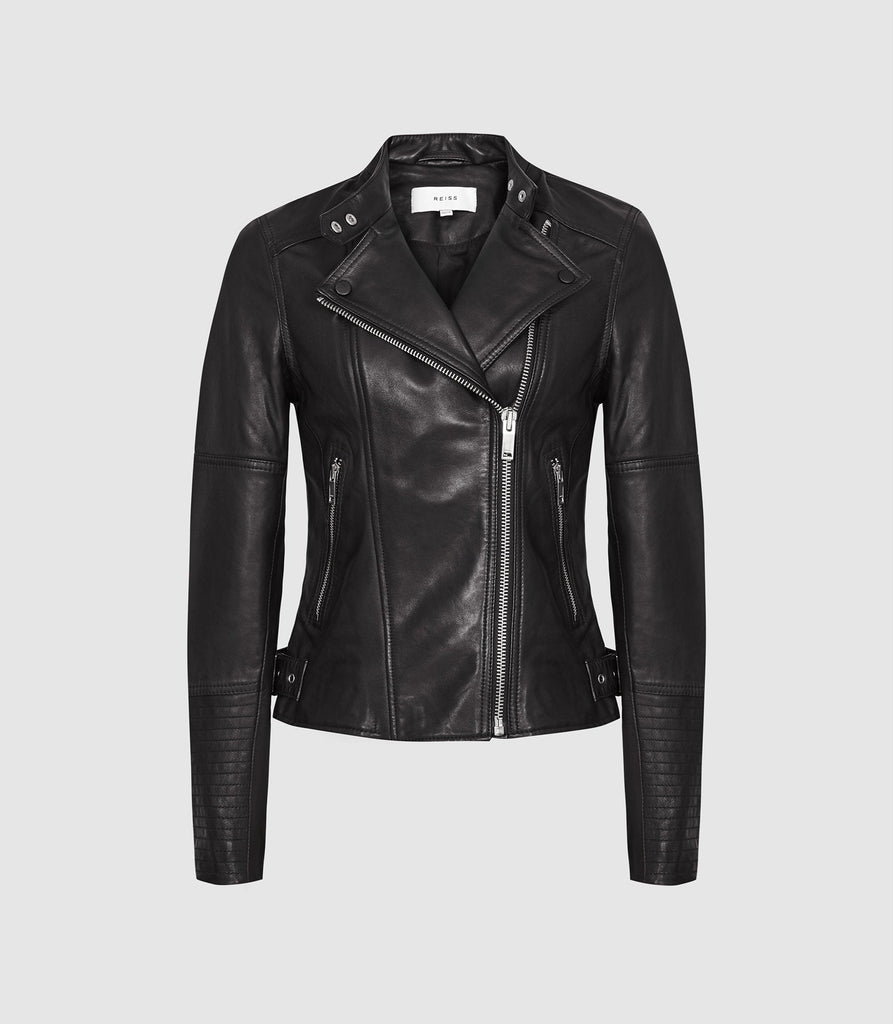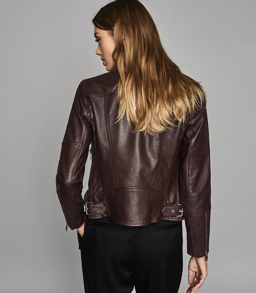 REISS TALLIS LEATHER BIKER JACKET PLUM