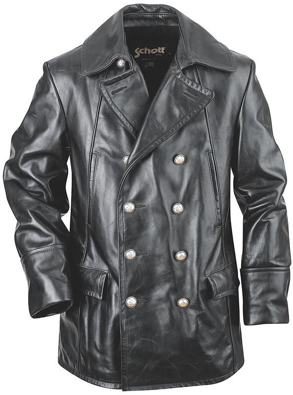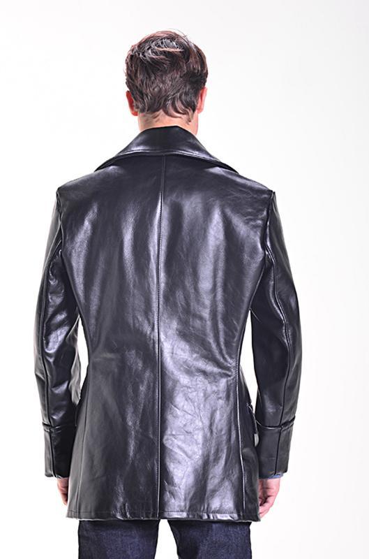 Men's double breasted black military waxy cowhide leather jacket with metal star buttons and wool twill lining. This jacket is made in the USA. With smooth leather and durable construction the jacket will wear well over time, and the classic features ensures it will never go out of style. For a size large, the back length measures 32 inches, this is a slim fitting garment.
