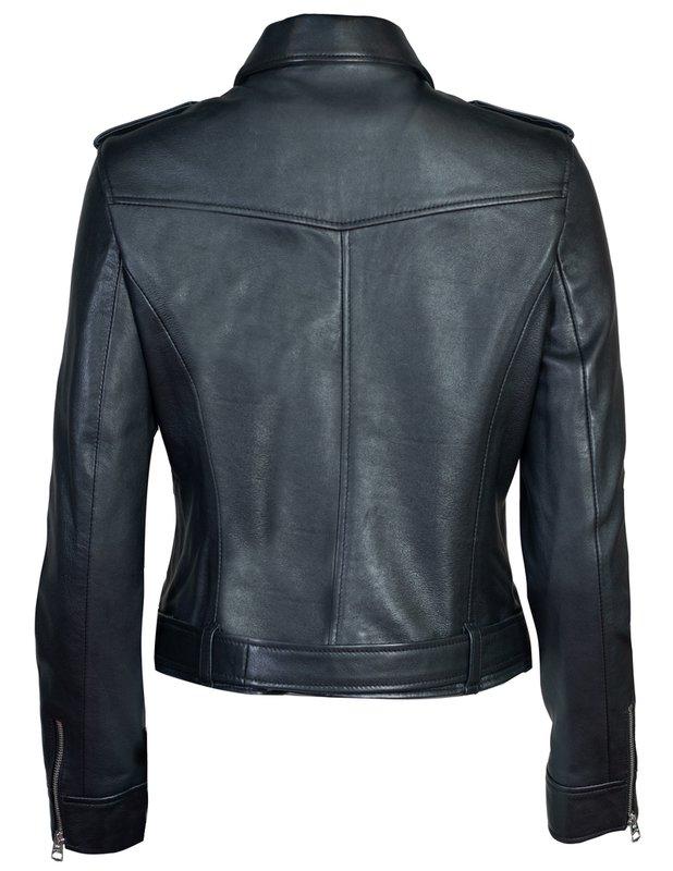Women's 21" lambskin collared moto jacket with detachable belt, two lower front zipper pockets, two zipper chest pockets, epaulets and nickel trim. Satin lining.