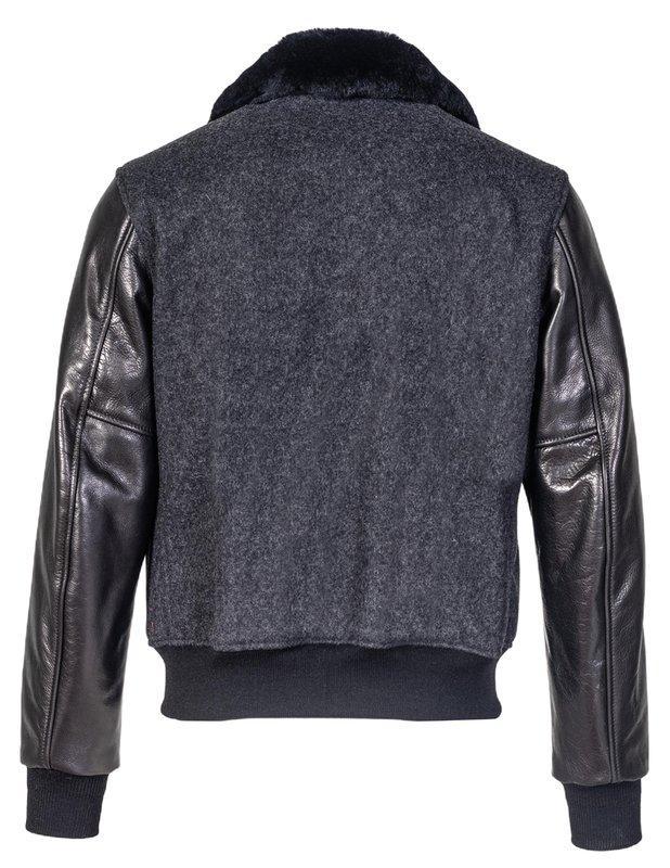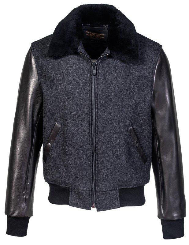 Men’s 27” B-15 flight jacket made of a 24-oz wool blend and waxy natural cowhide is a stylish addition to your wardrobe. Front zip closure, two lower slash pockets with snaps, and knit cuffs and waistband. Fully lined with onion-quilted nylon for comfort and warmth. The genuine sheepskin collar and contrasting cowhide sleeves and trim add to the retro military look.