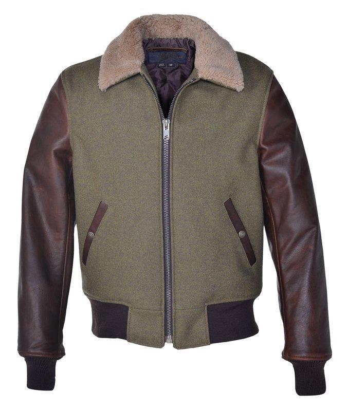 Schott NYC Men's B-15 Style Wool Jacket, Leather Sleeves and Genuine Sheepskin Collar