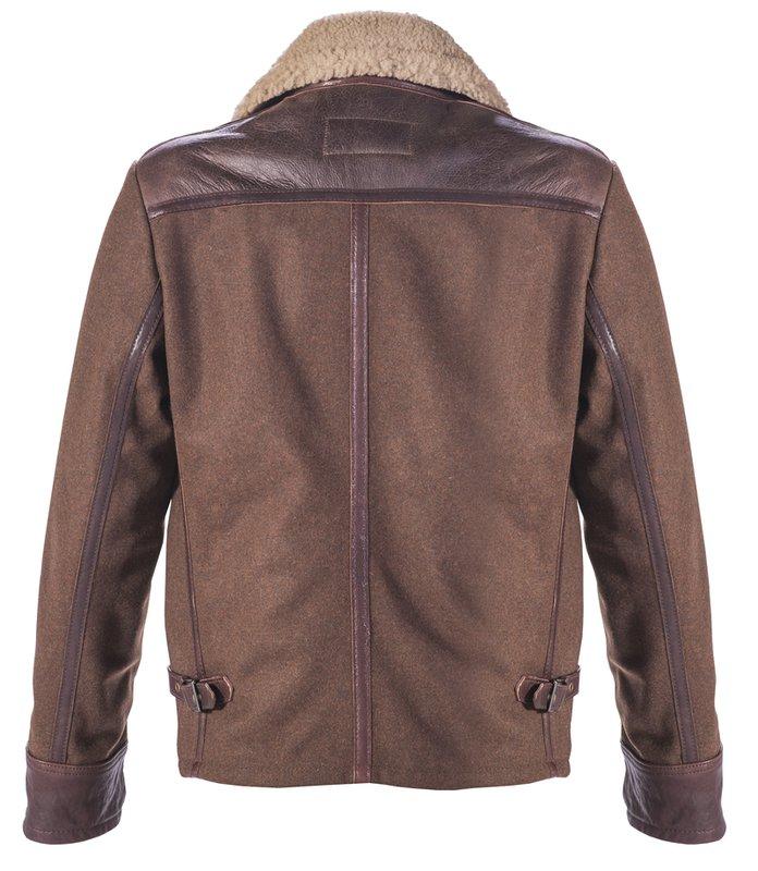 The spread sherpa collar is made from plush sheepskin with a leather latch to guard against wind and weather. Wool back with cowhide trim and a cowhide panel across the upper back. Wool sleeves with soft leather cuffs. Zip front, two-way front leather pockets with button closure, and leather side adjustments.