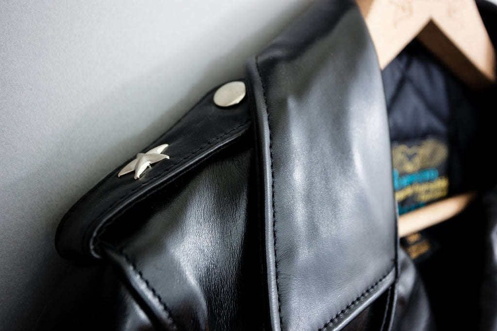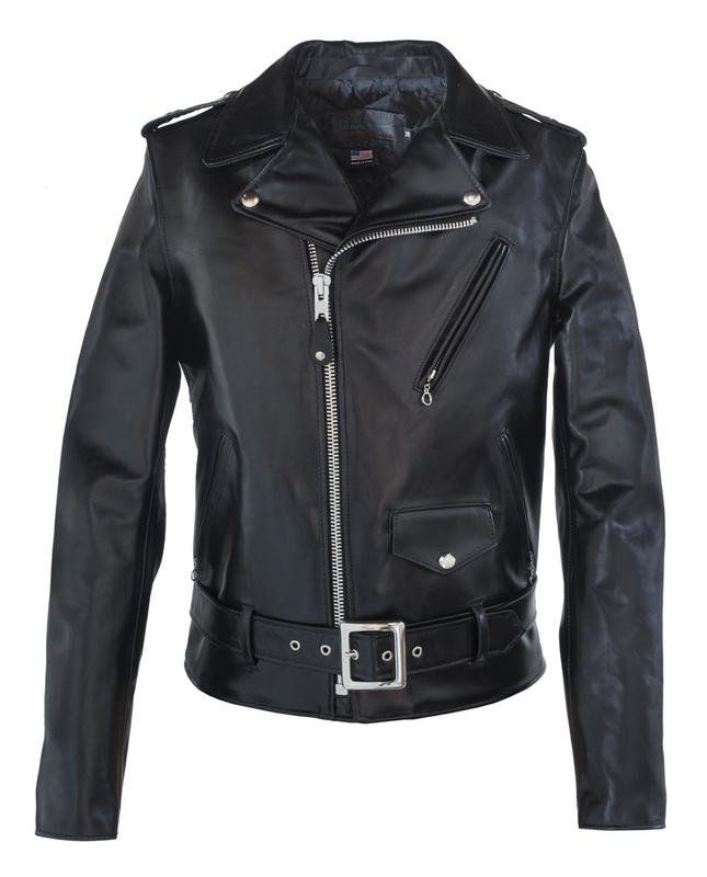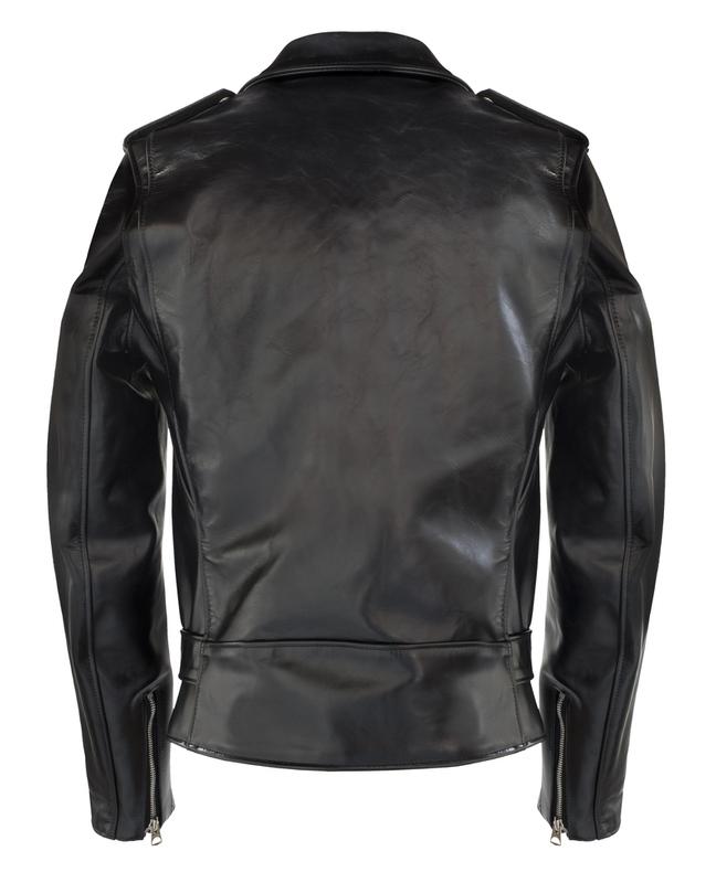The Schott 613SH vintage Perfecto® black biker jacket is made from heavyweight horsehide leather and features an asymmetrical front zipper and bi-swing back panels.