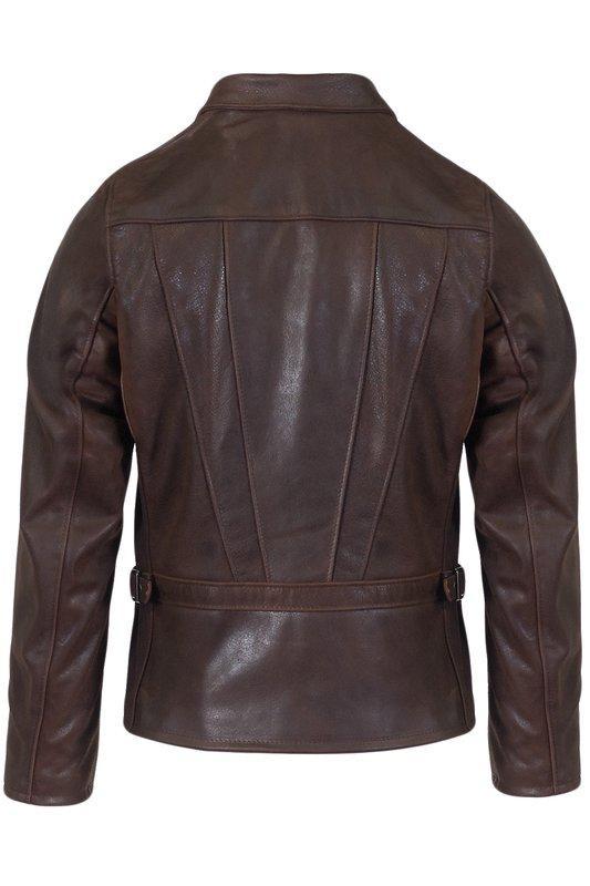 26” waxy naked buffalo delivery jacket features zip front closure, two lower slash pockets, one interior pocket on the left hand side, multi panel “sunset” back detail, adjustable side tabs and printed cotton lining.