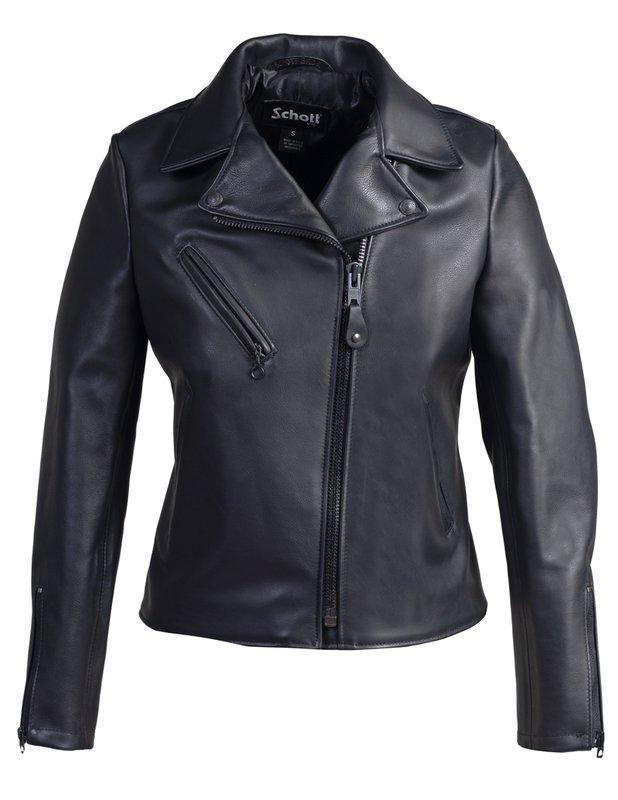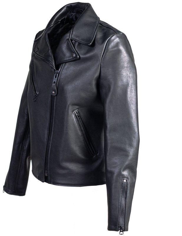 22.5" lightweight waxy cowhide clean motorcycle jacket features 3 front zipper pockets, matte black hardware and poly twill Schott logo lining.