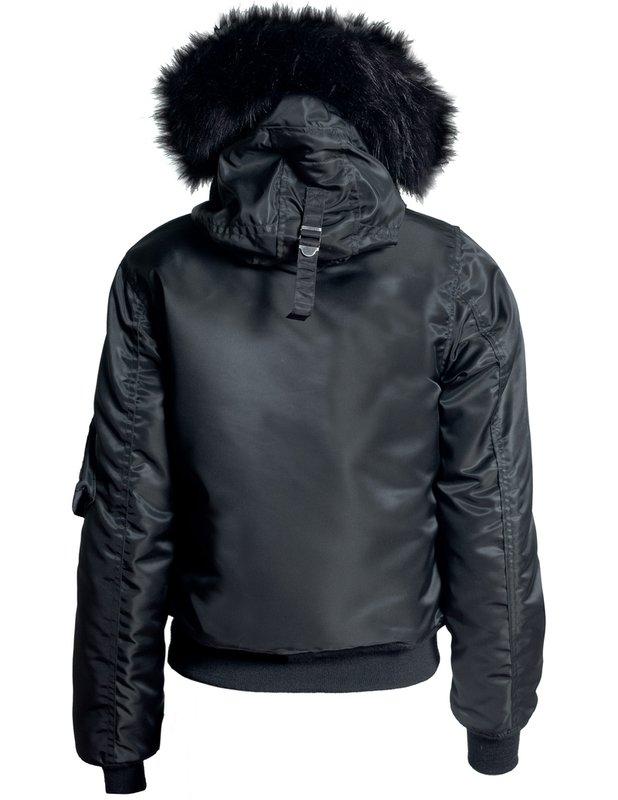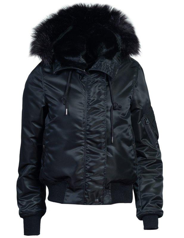 Women's 23" nylon flight satin polyfill N-2B jacket with removable faux fur trim snorkel hood. Features zip front closure with snap over fly piece, two lower zipper pockets, zipper pencil pocket on sleeve and tonal Schott embroidery.