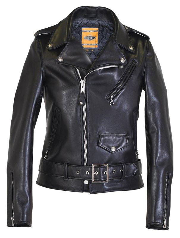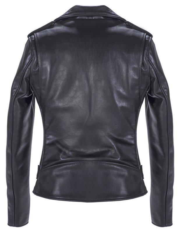 Women’s 23” classic motorcycle jacket cut from soft and durable, full-grain naked cowhide leather. On this jacket, you’ll find iconic moto details including an asymmetrical front zipper, shoulder epaulets, a buckled half-belt, and snap-down collar and lapel. The bi-swing back lends comfort while the traditional covered wrist gussets and small diamond quilted lining help to resist the elements.