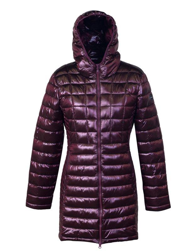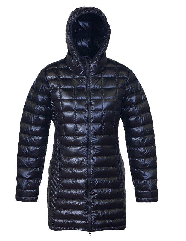 32” shiny nylon pack down parka with hood features two way zip front closure, two lower on seam zip pockets and multi panel quilted details. 90/10 down fill.