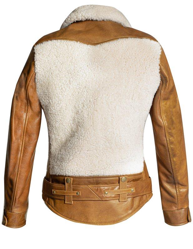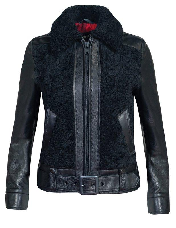 Curly sheepskin jacket with pebbled cowhide sleeves, trim and removable belt. Two lower slash front pockets, zip front closure and removable belt. Cotton plaid body lining, poly twill sleeve lining.