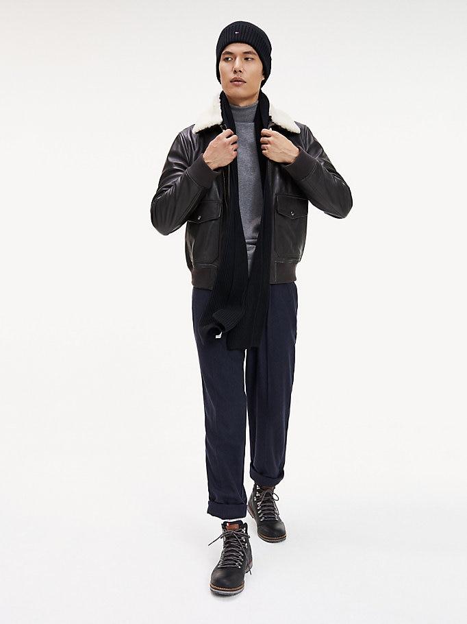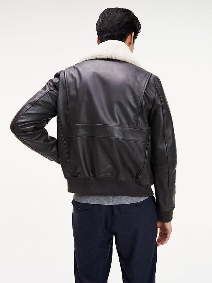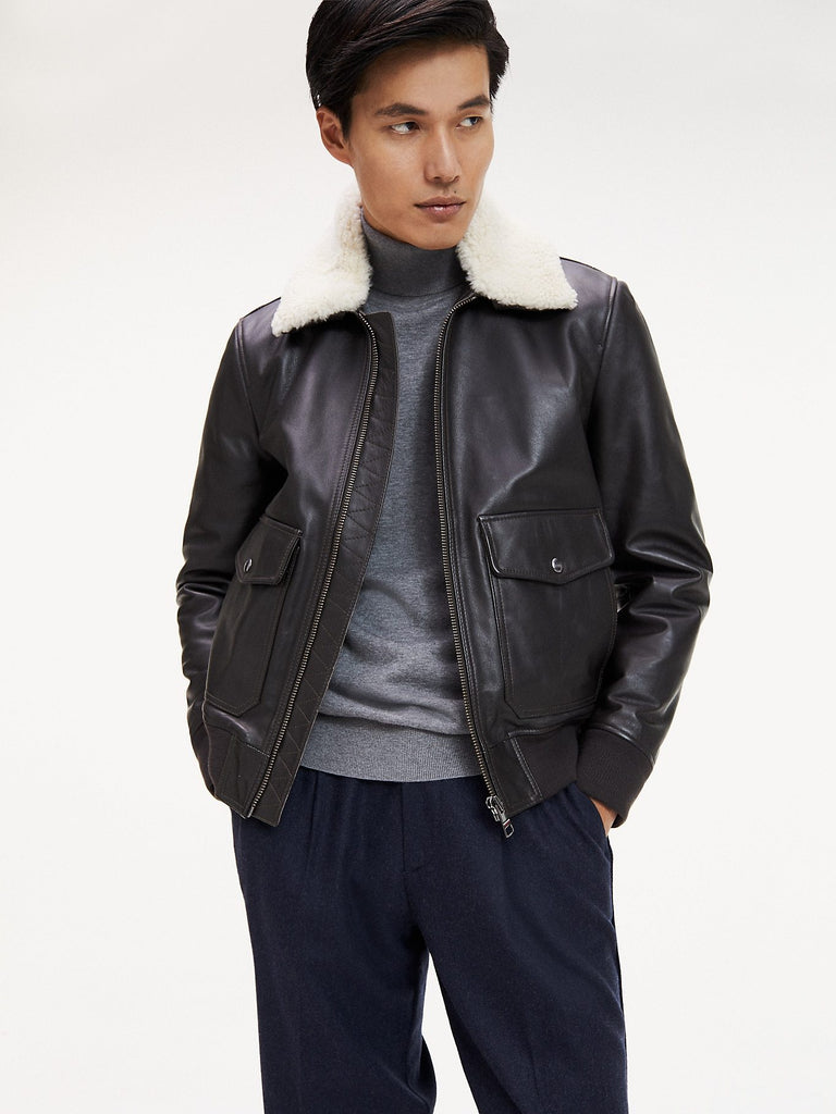 TOMMY HILFIGER SHEARLING COLLAR LEATHER BOMBER JACKET